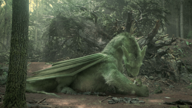 The smart decision has been made here to make Elliot a silent character, which has the heroic dragon speaking in roars, growls and primarily body language. You’d be amazed at how much more can be conveyed via subdued physical movements instead of having your CGI creations shout things like “BANANA!” over and over again until everyone in the theater has a horrible migraine. The script actually devotes a lot of time in the first few scenes of Pete’s Dragon to just showing our two main characters romping around in the woods, perfectly establishing why these two have such a strong bond. They look out for each other, care for one another, their bond is immediately understood and imprinted on the viewer, which is thanks in no small part to Oakes Fegley, a child actor whose kind of a revelation in his performance here.