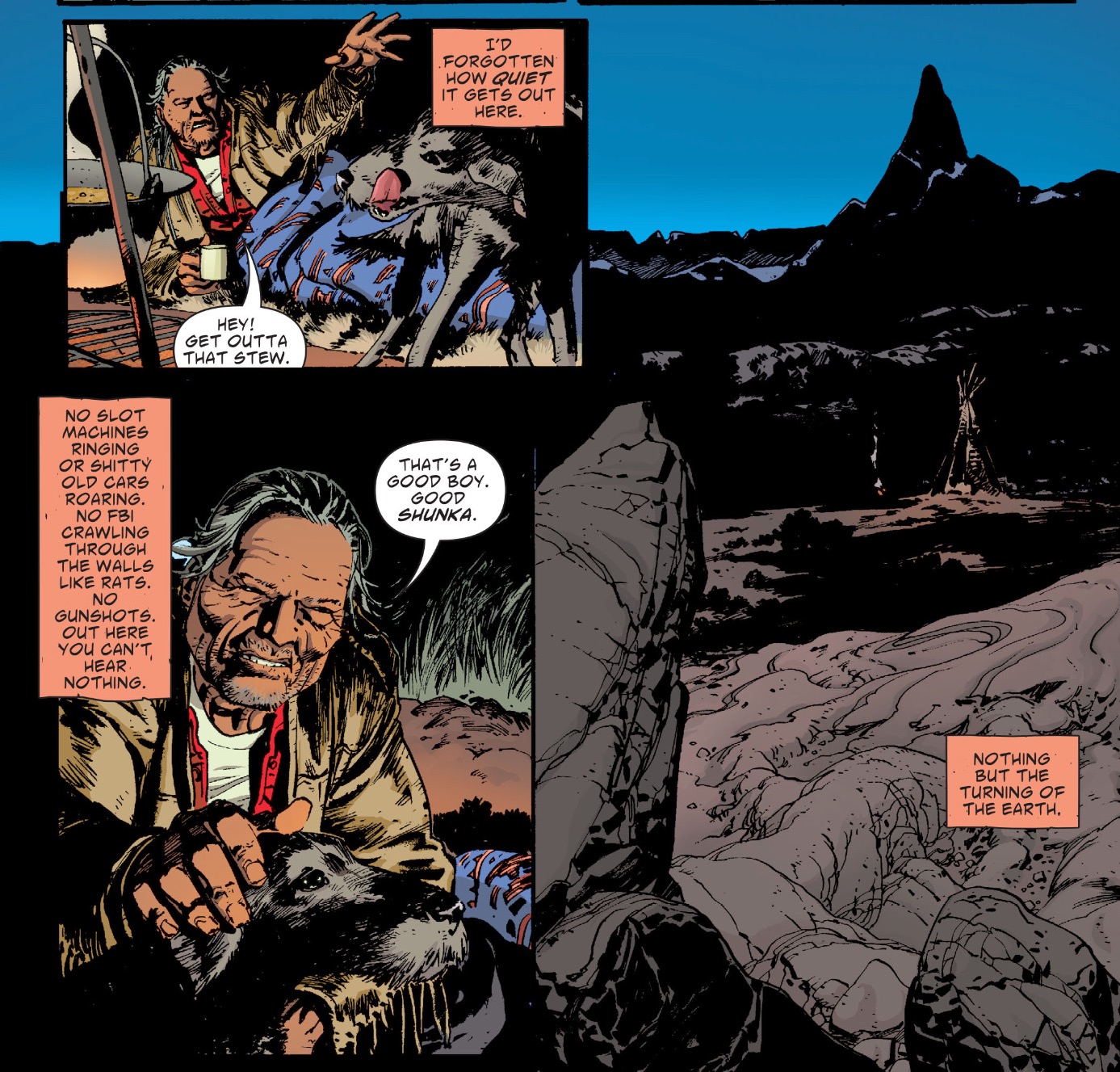 So far, so Departed. But as the series continues, it reveals itself to be far more than just Dash’s story. He moves to the sidelines as the two-part storyline “Hoka Hey” gives equal weight to former comrades-in-revolution Lincoln and Gina. The second volume, Casino Boogie, is really a collection of different characters’ stories, all taking place in the fragmented timeframe of the night Red Crow opens his multimillion-dollar stimulus package for the reservation (or at least for himself), the Crazy Horse Casino – and, more importantly, the night Gina Bad Horse is murdered and scalped. We see multiple brawls between Dash and faux-Indian rabble-rouser Diesel (“I’m one-sixteenth Kickapoo, motherfucker!”); Gina’s final hours; Red Crow contemplating his hollow success; a teenager dreaming of a better life away from the Rez; and Catcher, the old man who predicted the coming shitstorm, floating spiritlike through all those stories, maybe a mystic, and maybe just mad.