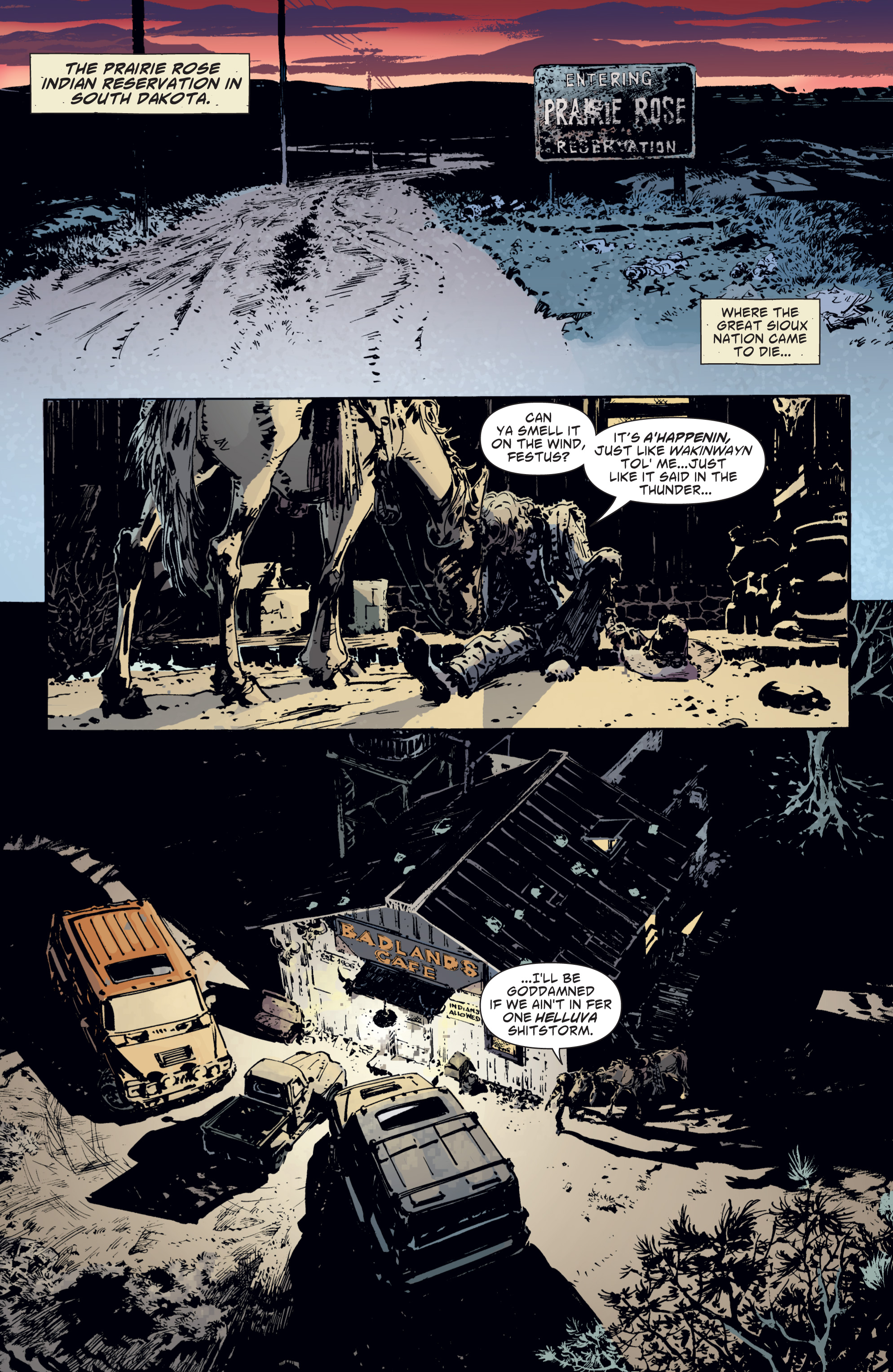 Before we continue, we’ve got to address the elephant in the room. Here’s an epic story of American Indian life — one of the very few in comics history — illustrated by Europeans and written by a Euro-American. So, is it a commendable work of cultural ambassadorship, or an American Dirt–esque embarrassment? Coming from the same perspective myself, it’s difficult to say, and Scalped is a thorny work no matter what angle you come at it from. On the one hand, Prairie Rose is a stereotypically squalid cesspool of poverty, crime, and alcoholism. On the other, Aaron leaves no doubt about whose fault that is: the legacy of colonization and genocide hangs heavy over the book. Aaron certainly shows his work: Scalped is full of dialogue in untranslated Lakota Sioux, and the characters’ bookshelves are littered with real books on Indian activism and history. In many ways, it’s quietly radical. The FBI isn’t a force for justice, but oppression and petty vendettas. Even America’s great hero, George Washington, has his history of Indian genocide namechecked. On the other hand, most of the cast describe “the Rez” as a sinkhole they only want to escape. But then, a major part of Dash’s arc is learning to embrace and love his home just as his criminal past forces him to leave it. But then again, even Aaron’s own tributes to Indian heritage are full of platitudes and exoticized stereotypes.