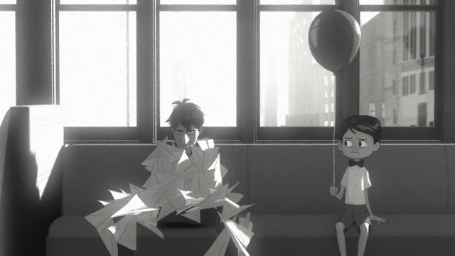 The short is mostly silent except the score, but a young man officially named George (John Kahrs) is on an el platform on his way to work. One of his papers hits Meg (Kari Wahlgren) in the face, and she’s slightly less than amused by that. But it gets a red lipstick mark on it, the only colour in the short. She gets on one train, and he gets on another. He goes to a dull office job, where he deals with enormous stacks of paper. Then, he sees her at an interview across the street in another tall building. He folds sheet after sheet of paper into airplanes in the hopes of catching her attention, but they all miss—until he gets to the one with her lip prints on it. His boss notices that he’s flung all his work out the window and is less than pleased, but George makes the decision that he cares more about Meg and their chance encounter than his job.