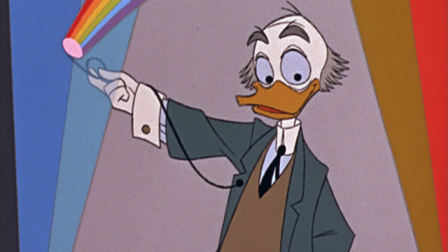 When the show moved to NBC, it took on a new title. It had been Walt Disney’s Disneyland and Walt Disney Presents on ABC. The first episode was actually divided in half; half of it was a special starring the first animated character Disney created for TV. Yes, folks, it’s the introduction of Professor Ludwig Von Drake, who would appear over the years as an expert in whatever Disney needed an expert in. Here, he is a an expert in colour, teaching us a fair amount of the science. Which is actually not so bad, as far as it goes.
