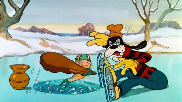 Meanwhile, Donald is acting to type. Pluto is sleeping peacefully next to a small fire on the bank of the frozen river where they’re all cavorting. Nothing wrong with that—honestly, he might as well have been left at home, for all of me. But Donald decides that what would be fun is a light spot of animal cruelty. He finds two extra pairs of ice skates and straps them to Pluto’s paws, then hides and wakes him up by meowing at him. Because sure. Then they didn’t know how to resolve it and put Donald in danger instead and expected us to care.