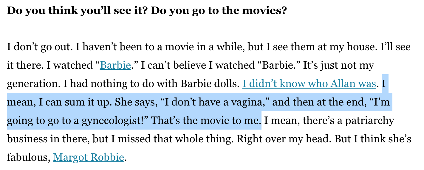 Oh, and hi Barbie! Like Barbie herself, Barbie represents many things: a delightful, visually dazzling comedy for all ages, a treat for the Mistress America heads, an enormously successful piece of corporate synergy with some light digs at the idea of corporate synergy (that won’t affect the plans for Mattel to make a dark, “A24-type” movie about Barney the dinosaur), a Feminism 101 pamphlet that’s shallow but resonant for the non-online women and girls who don’t think about these things very often, something to replace The Nice Guys in discussions of Ryan Gosling’s comedic talents, a place for Noah Baumbach to put his Stephen Malkmus takes. But most of all, it is a movie (or maybe even just five minutes of a movie) that will absolutely fuck your shit up if you happen to be a trans girl who named herself (and consciously and unconsciously modeled herself) after Greta Gerwig. I won’t blame anybody who wanted off the Mattel-branded ride, and I found varying levels of faults with it both times I saw it, but it hit me on such a molecular level that I can’t do anything but cherish it, especially when it somehow managed this as a four-quadrant blockbuster under the supervision of a toy company. I promise that I will try to whip my thoughts on it into an articlelike shape, but I don’t know that I’ll be able to get to the heart of the matter better than John Carpenter did: