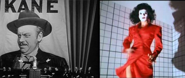 Granted the newsreel footage parodies the conventions of the time for celebrating the life of a celebrated, if controversial, figure. But it also functions as a trailer, laying out an archetypal rise and fall narrative. It’s an advertisement for itself, just like films such as Flashdance were noted for their appropriation of advertising imagery.