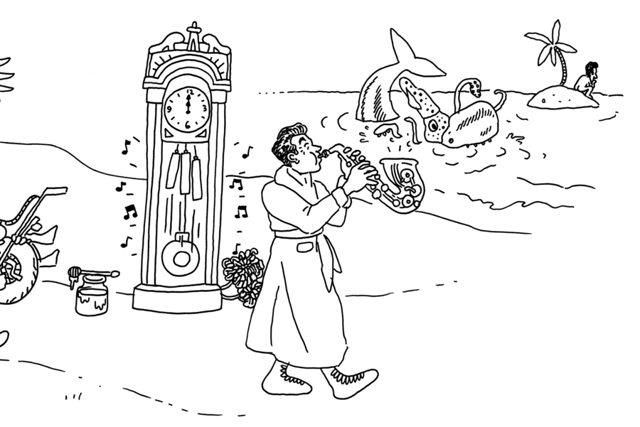 Boxer with saxophone: That would be for Here Comes Mr. Jordan, where the main character is a boxer who tries and fails to play the saxophone.
