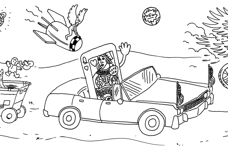 Queen of hearts in car with JFK sticker: Okay, a lot of people have said that the card is for The Manchurian Candidate. Criterion has put clues for films that have already come out in these drawings before (in fact, there’s one coming up a little later), but this isn’t one, because the central card in Candidate is a queen of diamonds. Or maybe it was just a mistake, since you could reasonably make the argument that the queen of hearts being in the Presidential motorcade would be too specific a nod to Candidate for it to be anything else. I dunno, I’m going with Undetermined on the card. On the JFK thing, though, that’s definitely a reference to the documentary Primary (possibly more of Robert Drew’s JFK documentaries as well, and maybe JFK too, but I’m not sure about that one).