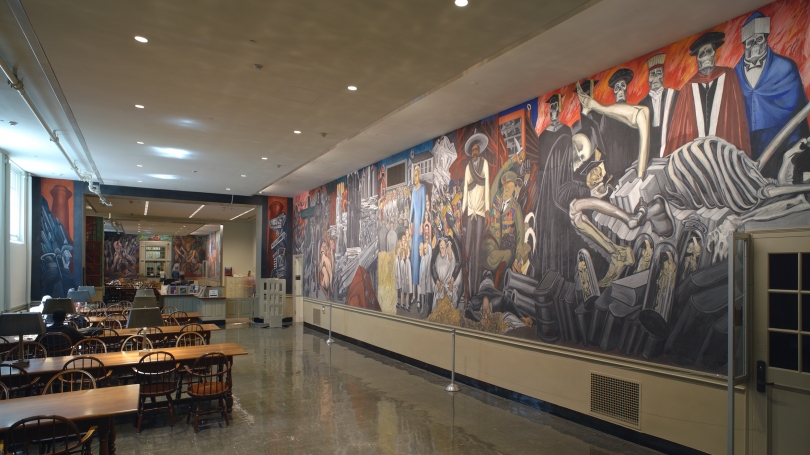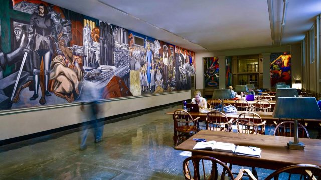 Orozco painted directly on the walls, and the mural’s colors have remained vibrant, a riot of color and expression looming over the traditional wooden shelving and thick, glossy tables that still furnish the library proper. You could look down at where some suffering undergraduate carved his initials, and back up to a man getting his heart carved out, moving backward and forward in time, from the ancient past to Orozco’s time to your own. (You’ll see dozens of computers in the reserve room now. I’m not sure there was a single one on the floor when I first visited the building, and laptops didn’t exist. Orozco painted his work to last, but there was no way he could have anticipated all the changes that were to come.)
